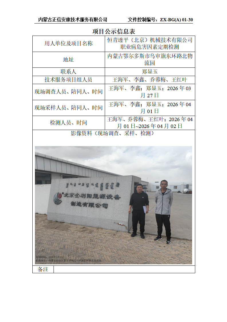 >>项目公示>>恒青透平(北京)机械技术有限公司职业病危害因素定期检测