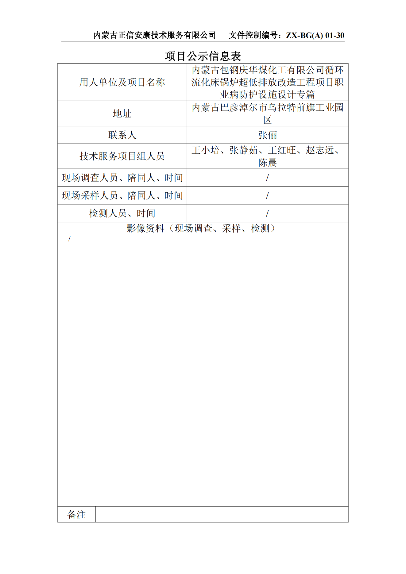 >>项目公示>>内蒙古包钢庆华煤化工有限公司循环流化床锅炉超低排放改造工程项目职业病防护设施设计专篇