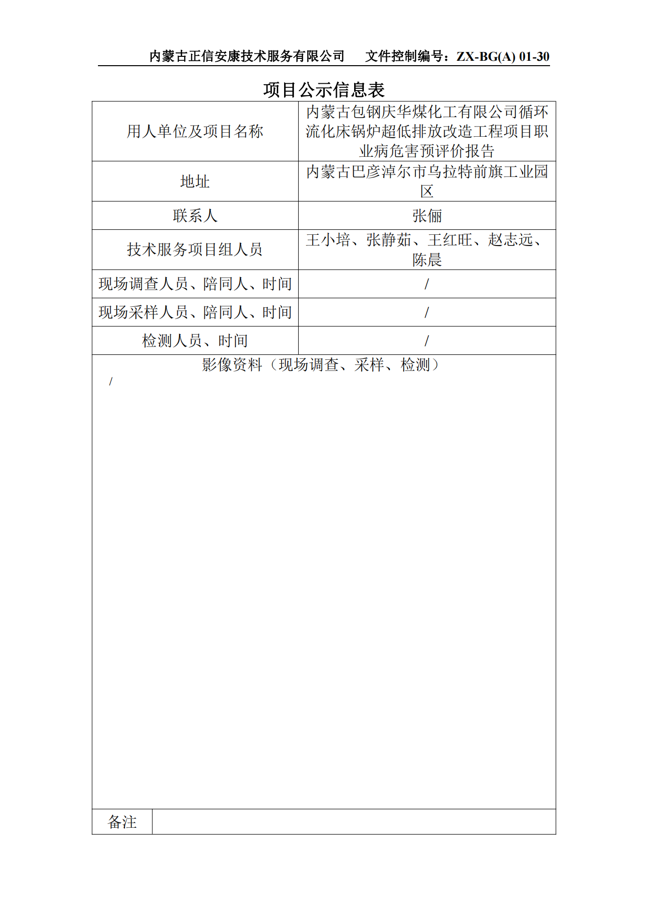 >>项目公示>>内蒙古包钢庆华煤化工有限公司循环流化床锅炉超低排放改造工程项目职业病危害预评价