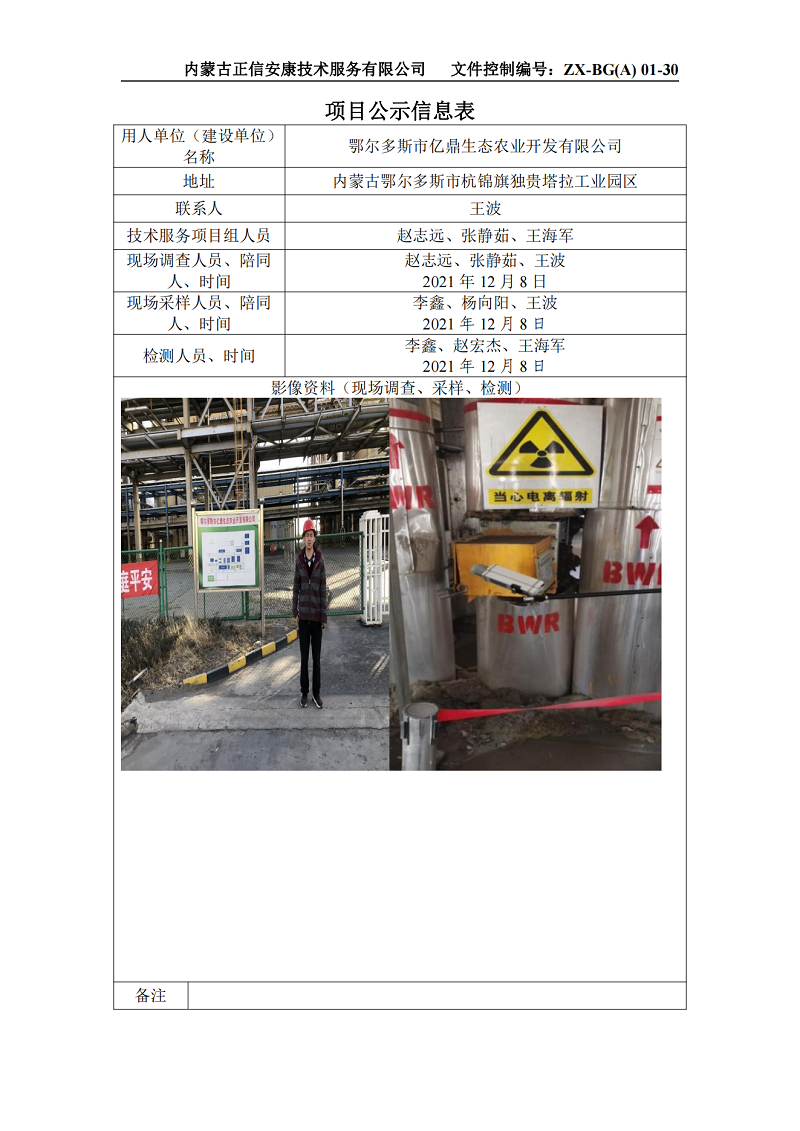 鄂尔多斯市亿鼎生态农业开发有限公司职业病危害放射防护现状评价报告项目公示信息表