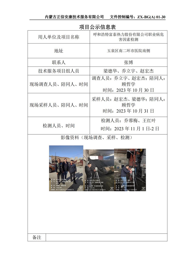 呼和浩特富泰热力股份有限公司职业病危害因素检测项目公示信息表(1)_