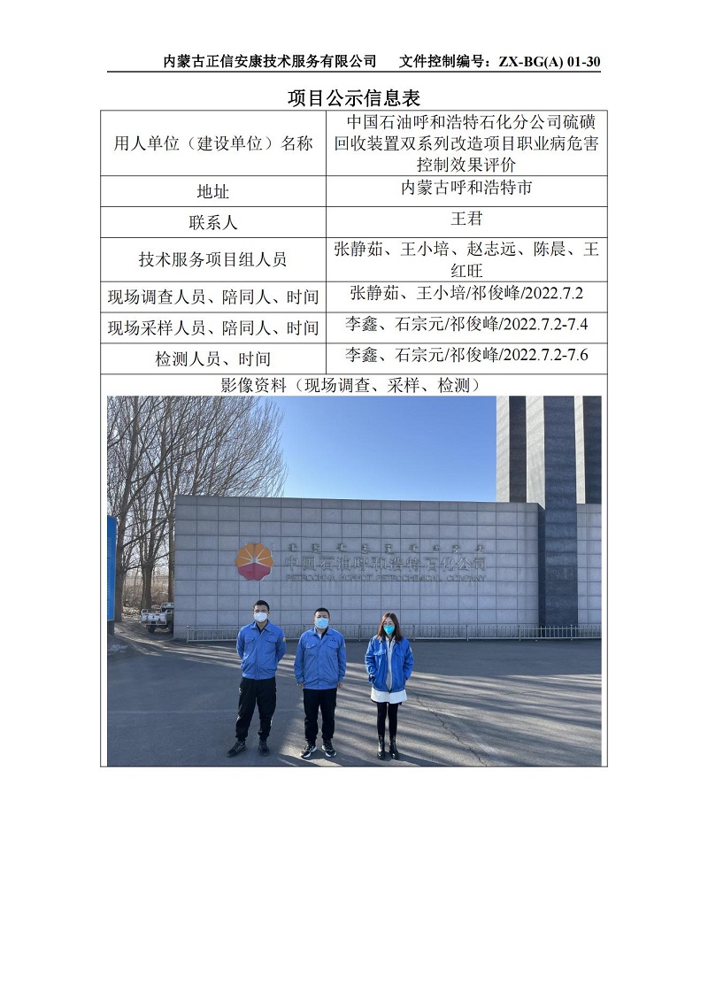 中国石油呼和浩特石化分公司硫磺回收装置双系列改造项目职业病危害控制效果评价信息公示