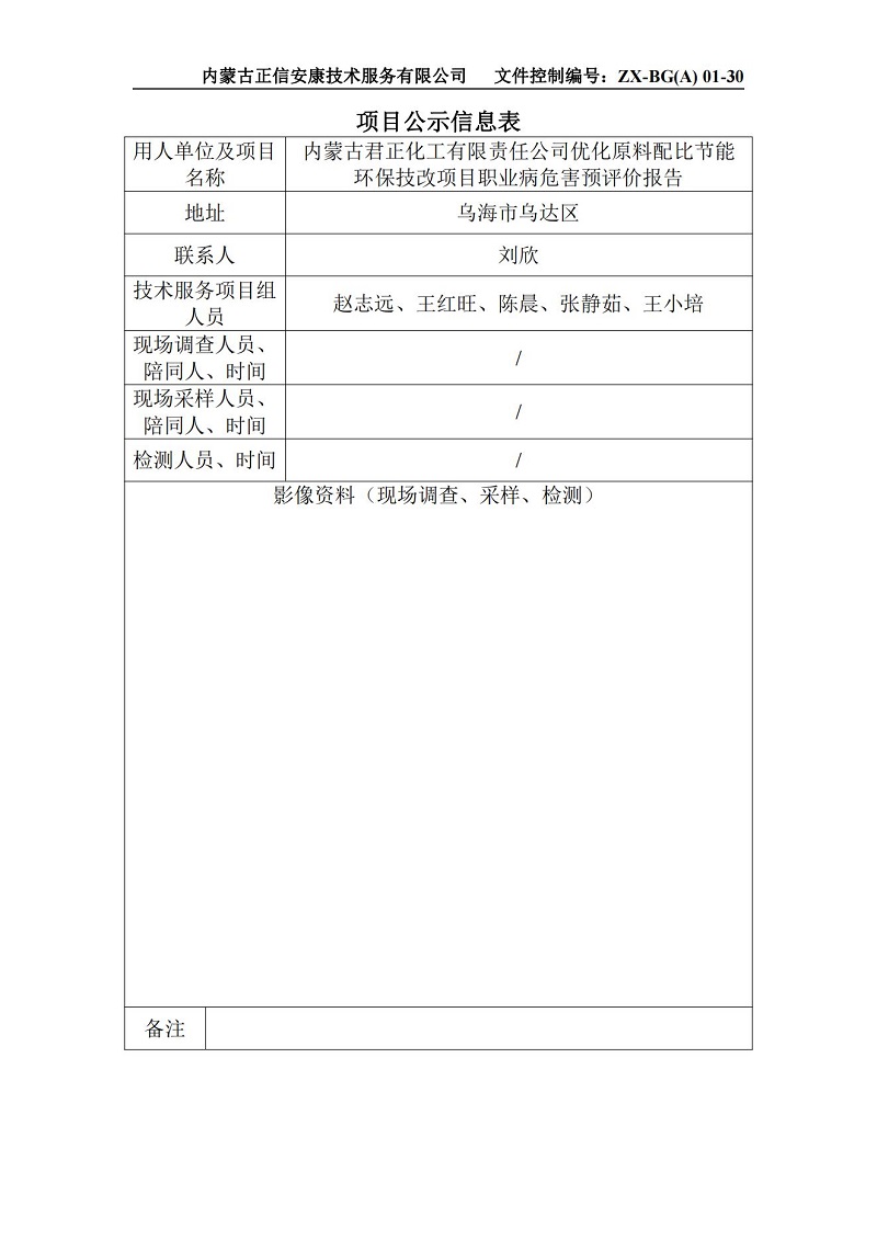 内蒙古君正化工有限责任公司配套原料碳化钙产能置换技术升级改造项目职业病危害预评价报告-项目公示信息表_00