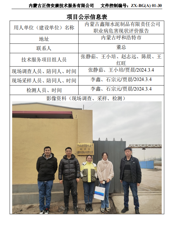 >>项目公示>>内蒙古鑫翔水泥制品有限责任公司职业病危害现状评价报告
