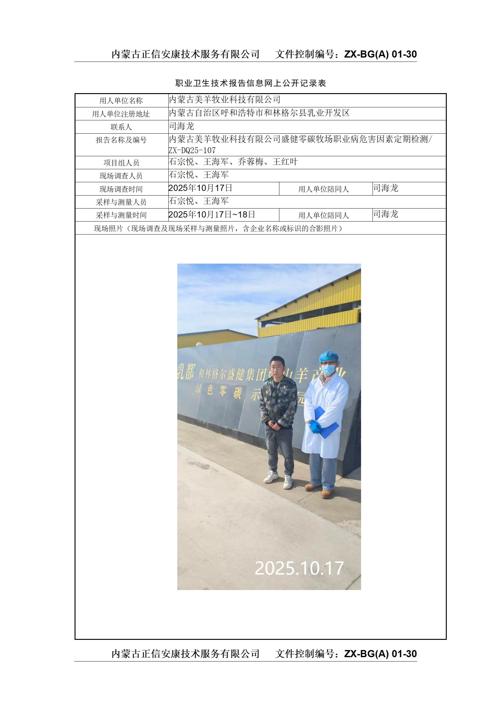 >>项目公示>>内蒙古美羊牧业科技有限公司盛健零碳牧场职业病危害因素定期检测