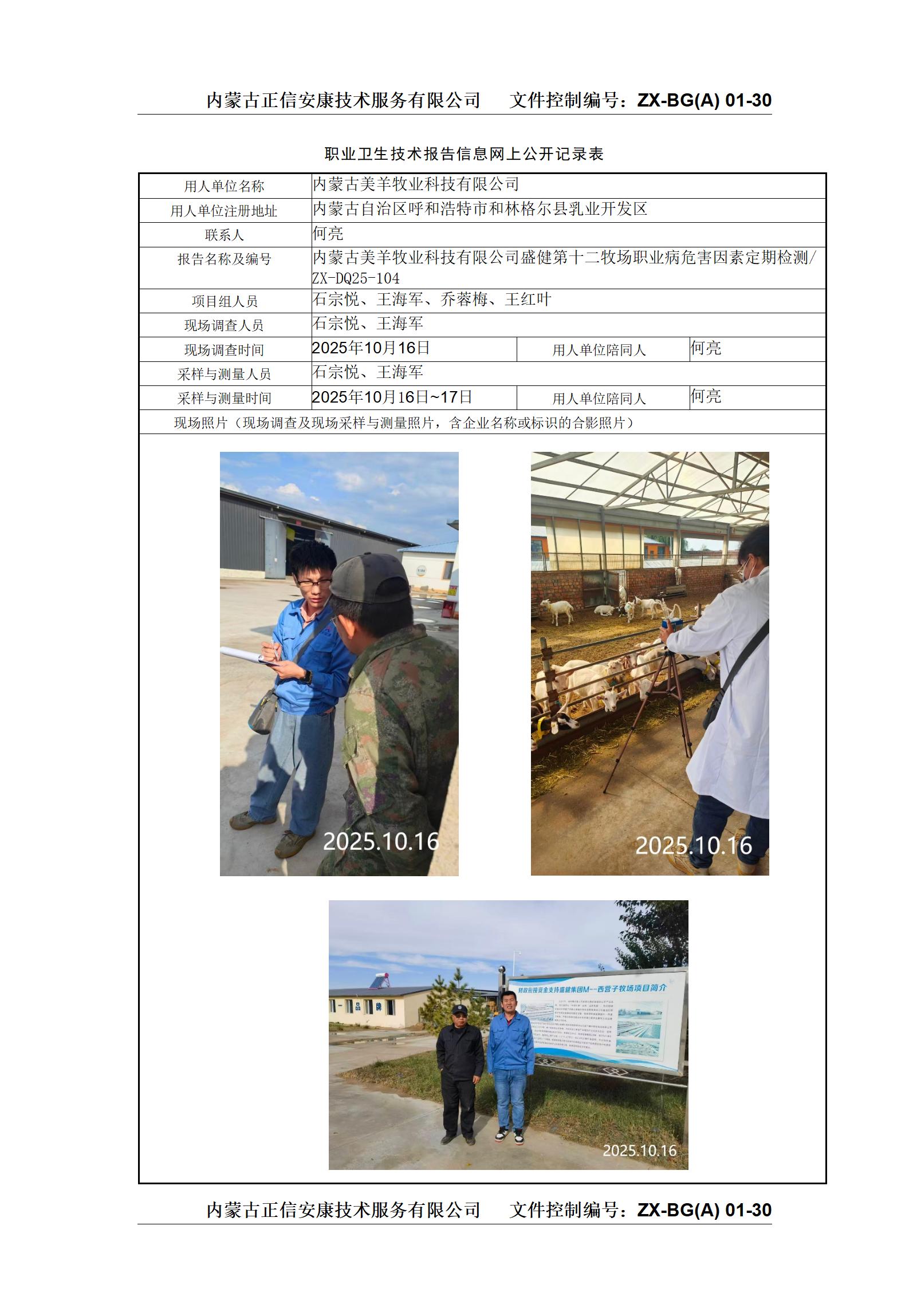 >>项目公示>>内蒙古美羊牧业科技有限公司盛健第十二牧场职业病危害因素定期检测