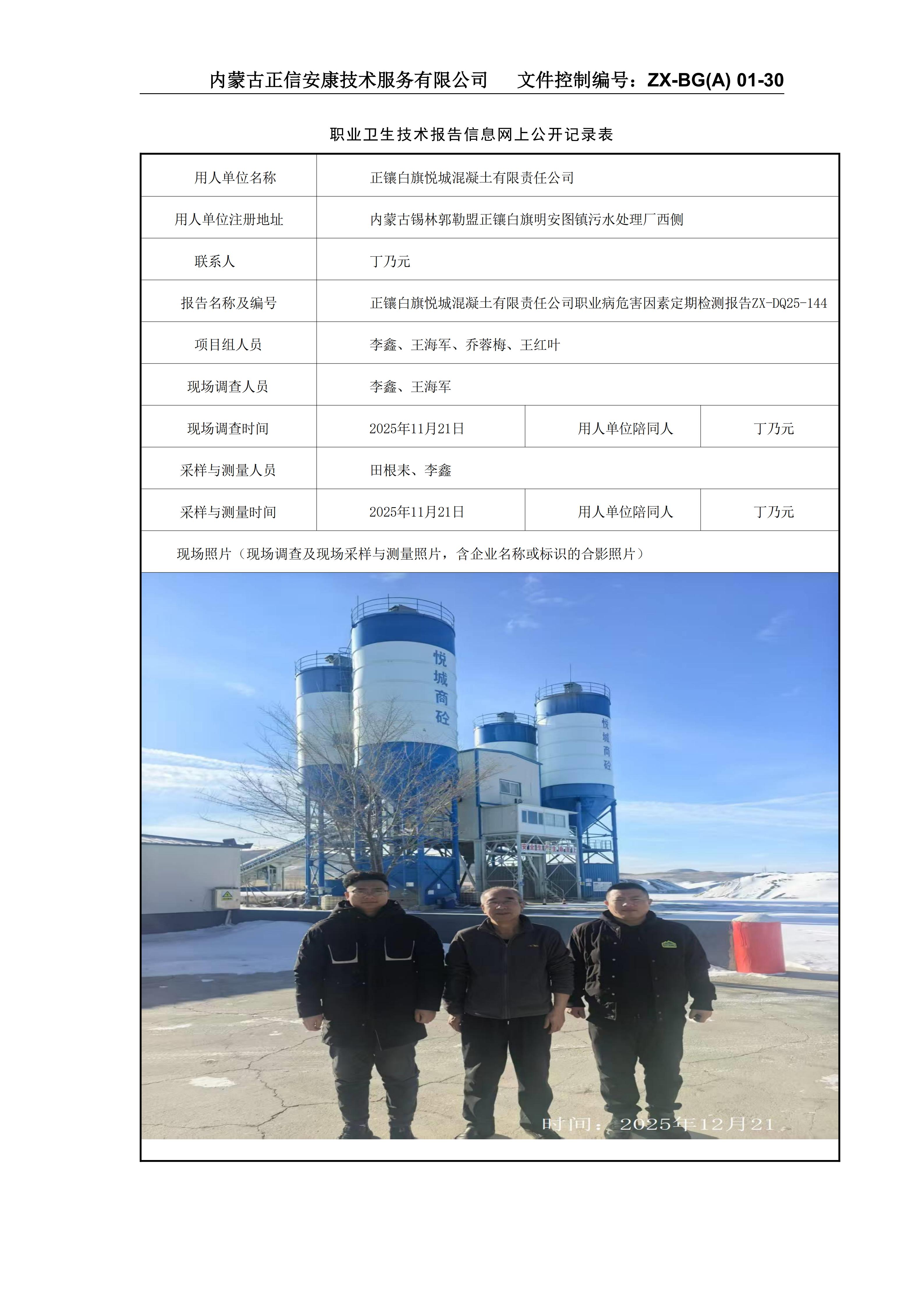 正镶白旗悦城混凝土有限责任公司职业病危害因素定期检测报告