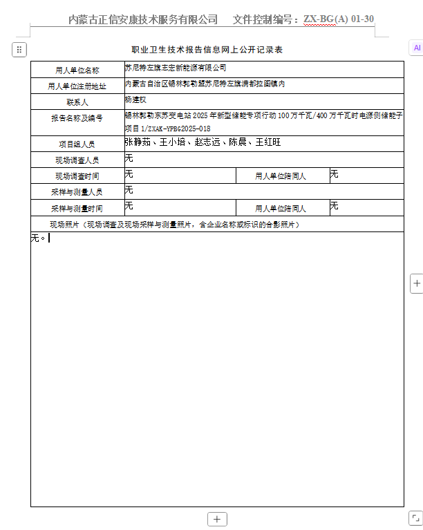锡林郭勒东苏变电站2025年新型储能专项行动100万千瓦/400万千瓦时电源侧储能子项目1职业病危害预评价